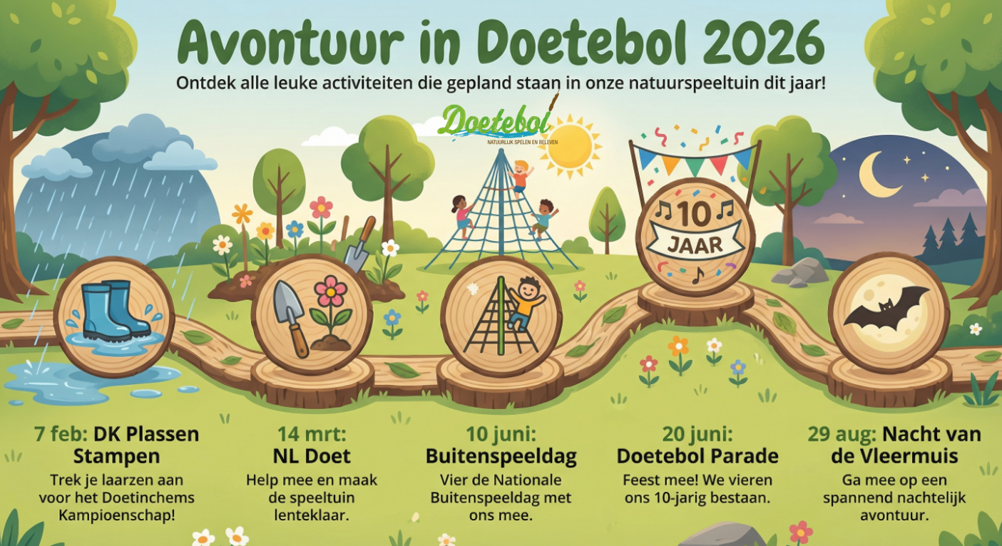 Natuurspeeltuin Doetebol bestaat 10 jaar! Dat vieren we met een middag vol plezier voor jong en oud. Houdt ons nieuws in de gaten, want dit wil je niet missen!